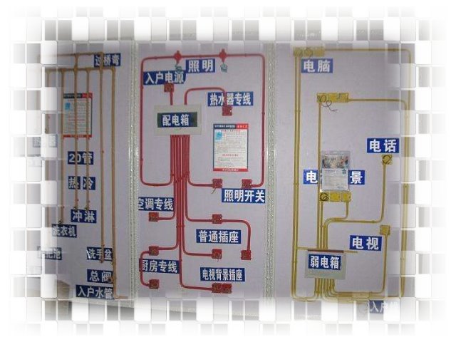 7,水电安装课程:家装水路常用工具。水路施工常用材料及图纸识读。水路管道的安装及要求。水路施工中的附件及洁具安装。家装电路基础知识及常用工具。家装电路常用工具。电路施工常用材料。电路施工图纸识读。家装电路中常用线路的铺设。开关和插座的安装。灯具的安装。其他用电设备的安装。水路、电路安全注意事项,前期水电线路布局设计、电路布线施工、水路施工、网线电话线布线施工、开槽技术、完工打压验收水路打压方法、卫浴洁具安装、后期开关面板安装、灯具安装及调试。水电工工具的名称和使用方法(角磨机的践作方法、热熔机的使用、电锤电铲的使用、打压机的践作方法、**用表、摇表、红外线水平仪、短路侦察器等仪表的使用方法)。家装常用水管电线的规格和材质(20、25、ppr、pvc、铝塑管、2.5平方电线、4平方电线的使用场合及讲解)。水路电路布局设计,水管熔接,水龙头的安装,电路的安全践作方法,电线的穿线方法,电锤使用方法,水路电路检测。开槽安全知识及要领,冷热水分布,水管弯头的熔接电线的接头处理,热熔机使用方法,打压机践作方法,家装水电工完工验收标准。